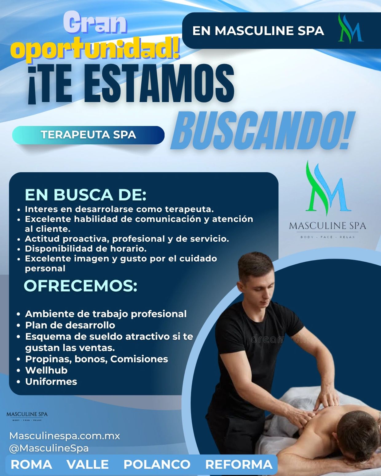 🚨 ¡ATENCIÓN! Masculine Spa está buscando a su próximo TERAPEUTA EN ENTRENAMIENTO 🚨 👔 EXCLUSIVO PARA HOMBRES de 18 a 27 años con actitud profesional, imagen juvenil y gusto por el cuidado masculino. 🌟 Somos un spa boutique especializado en estética masculina, con sucursales en: 📍 Roma Norte (Metrobús Durango) 📍 Polanco 📍 Reforma (Ángel de la Independencia) 📍 Colonia del Valle (frente a Parque Hundido) 🔥 ¿QUÉ TE OFRECEMOS? 💼 Ingreso mensual competitivo: ➡️ Base + Comisiones + Propinas + Bonos 💰 Gana entre $8,400 y $25,000 MXN al mes 🎓 Además: ✔️ Capacitación diaria + cursos certificados ✔️ Plan de crecimiento profesional ✔️ Servicios de spa incluidos 💆🏻♂️ ✔️ Uniformes sin costo 👕 ✔️ Excelente ambiente laboral 😄 ✅ REQUISITOS INDISPENSABLES: 🔹 Sexo: Masculino 🔹 Edad: 18 a 27 años 🔹 Imagen fresca y presentación impecable 🔹 Experiencia en: • Tratamientos faciales y corporales • Ventas • Atención al cliente 🔹 Disponibilidad de horario completo (incluyendo sábados) ❌ No contamos con horarios para estudiantes 🚀 Inicio inmediato 📲 ¿Te interesa formar parte del equipo? Mándanos tu CV por WhatsApp al: 55 4088 7721 (📩 solo mensajes, no llamadas) 🌐 Conócenos: masculinespa.com.mx 💪 ¡Conviértete en el nuevo especialista de Masculine Spa y transforma tu carrera hoy!
